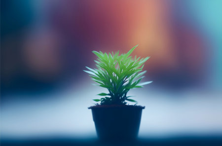 This image showcases a fresh green plant with delicate water droplets on its leaves, set in a pot against a softly blurred colorful background, creating a serene and vibrant atmosphere.
