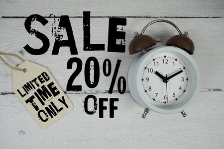 Sale 20% Off Limited Time Only with price tag and alarm clock on wooden background