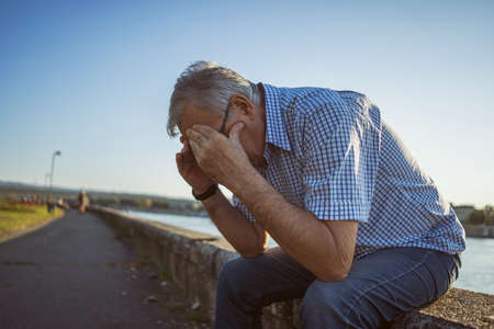 Outdoor portrait of senior man who is having headache.