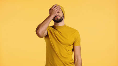 young man in beanie hat showing face palm isolated on yellow