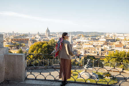 Woman enjoying beautiful morning cityscape of Rome, walking in Villa Borghese Park. Old fashioned woman wearing coat with colorful shawl in hair. Concept of italian lifestyle and travel
