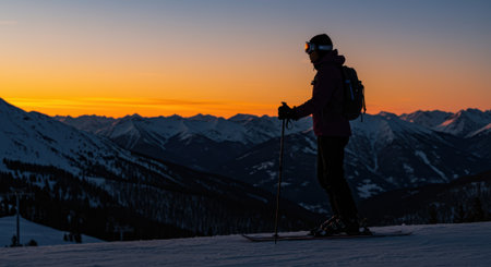 Man skis across a snowy ridge at sunset with layered mountain silhouettes and warm sky tones that produce strong contrast and a calm outdoor mood. Wide clean sky area provides copyspace and open space for text or graphic overlay