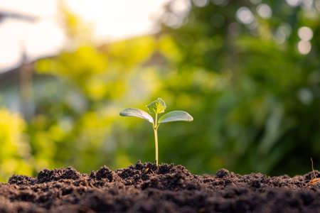 small plant growing in morning light at garden. concept earth day