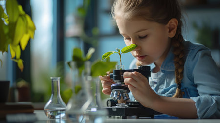 Little girl as a researcher and biologist looking at a small green leaf through a microscope with plant in glassware or flasks measuring beaker for science experiment in laboratory. Educational --ar 16:9 --v 6 Job ID: 20a32bc6-644c-4753-8867-2f88cc747959