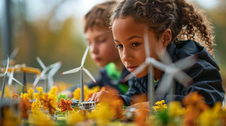 Selective focus shot of unrecognizable teacher holding wind turbine model telling teenagers about renewable energy