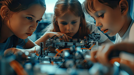 Children learning robotics in a classroom, assembling and programming a robotic hand with guidance. Interactive STEM activity sparks creativity and problem-solving in modern back-to-school education.