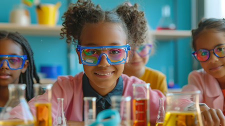 A group of children wearing safety goggles and lab coats are working on a project. Scene is focused and serious, as the children are engaged in a scientific activity
