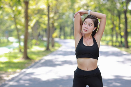 Young beautiful Asian woman in sports outfits doing stretching before workout outdoor in the park in the morning to get a healthy lifestyle. Healthy young woman warming up outdoors.