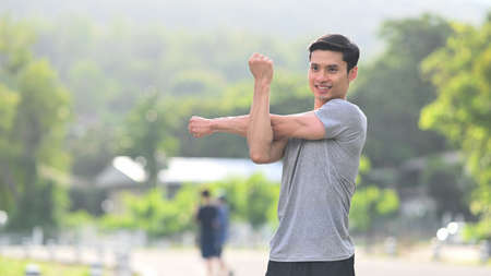 Happy Asian young sportsman doing a lower and upper body stretching before making an exercise in a park, stretching and workout concept. Sport man making a cardio and weight training workout.