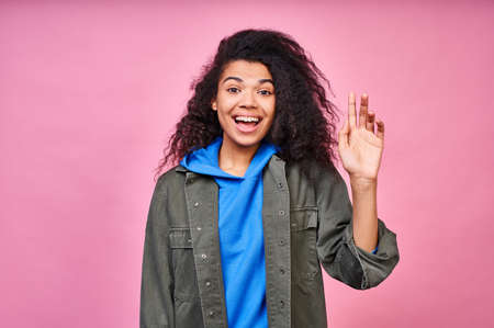 A young cute charming dark-skinned lady, wears casual clothes, has long curly hair, waves her hand in greeting and says hello, posing against a pink background.
