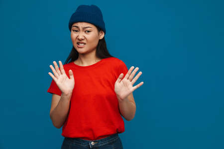 Displeased asian teen girl in hat showing stop gesture isolated over blue background
