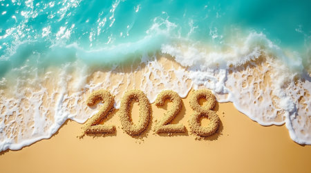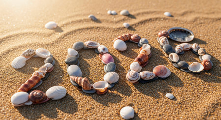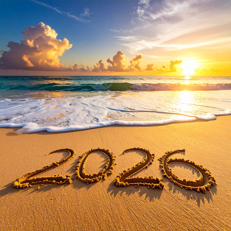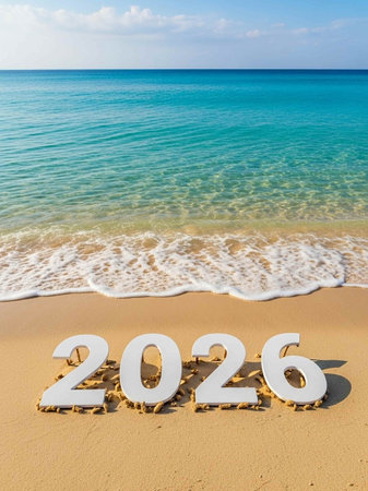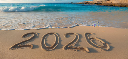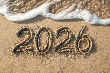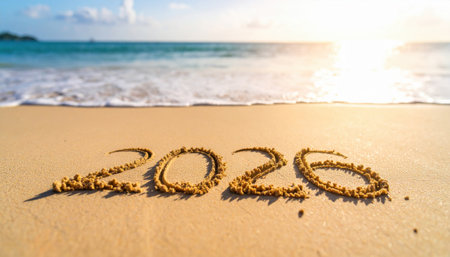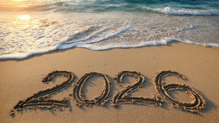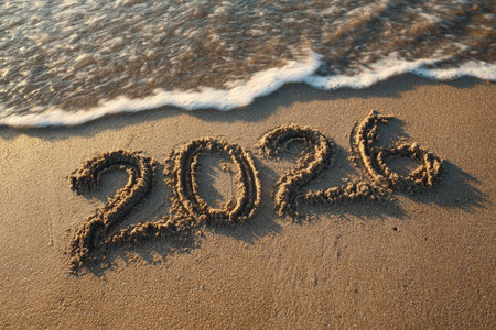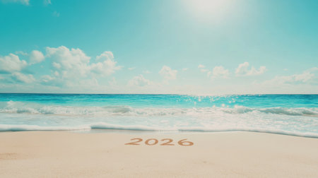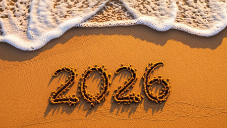 The year 2026 is inscribed on the sand, surrounded by seashells, capturing a serene beach scene with a focus on the upcoming year.