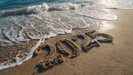 2025 written in the sand on a beach during sunrise. Peaceful summer vibes.