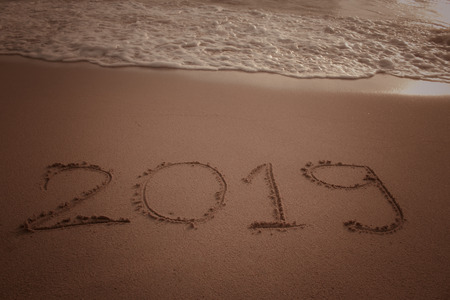 Vintage write 2019 on a beach sand background