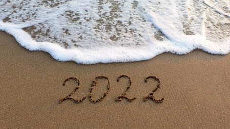 2022 numbers are written on sand on sea beach. New Year 2021 is coming concept. Background for New Year's banner or advertising