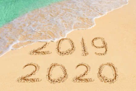 Inscription 2019 and 2020 on beach sand, wave covering 2019 digits. New Year 2020 coming concept