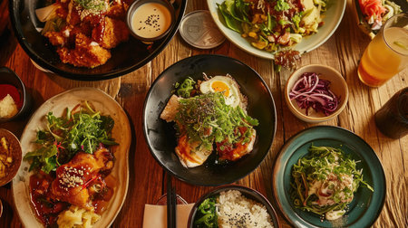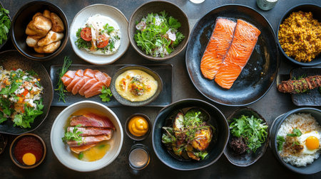 A vibrant collection of beautifully arranged dishes on a wooden table, showcasing a mix of gourmet foods, including salmon, salad, and a sunny-side-up egg, perfect for dining lovers.