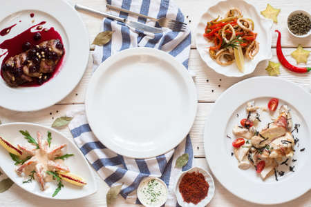 Top view of different dishes on the table in a restaurant. Restaurant menu