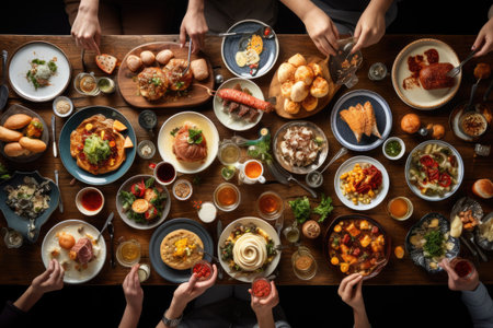Top view of group of people having dinner together at restaurant table, Brunch Choice Crowd Dining Food Options Eating Concept, top view, AI Generated