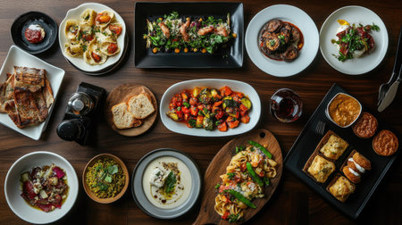 A delightful overhead view of a table laden with various dishes, including pasta, roasted vegetables, and desserts, set against a rich dark wood background, perfect for culinary inspiration.