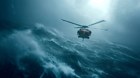 Rescue helicopter performing an emergency operation, navigating hazardous weather conditions above a tumultuous ocean with crashing waves and strong winds during a storm