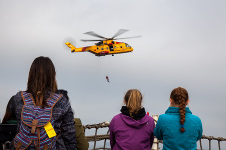 While onboard a Warship from the Canadian Forces Base in Esquimalt, British Columbia, a group of women watch a search and rescue demonstration of a CH-149 Cormorant Search and Rescue Aircraft.