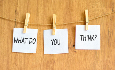 Support, help what do you think symbol. Concept words What do you think on beautiful white papers on wooden clothespin. Beautiful wooden background. Business what do you think concept. Copy space.
