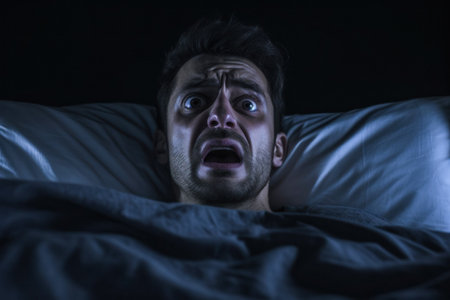 dramatic portrait of stressed and scared man alone in bed awake at night in fear after having a nightmare feeling paranoid holding the blanket in funny panic face expression
