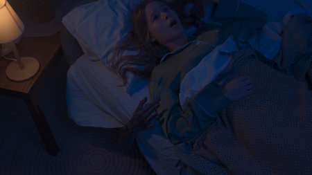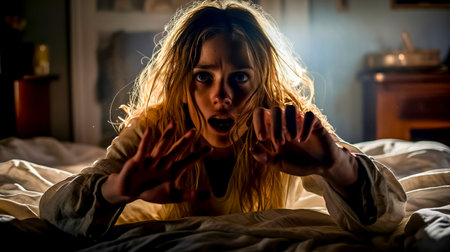 Scared woman screaming in bed at night. Shocked girl in the dark