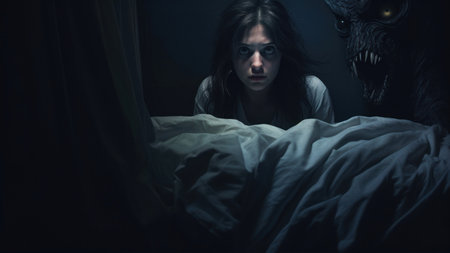 Woman sleeping in bed in dark apartment room, monster hiding under bed, scary arm crawling out, girl wakes up and screams. Halloween horror concept.