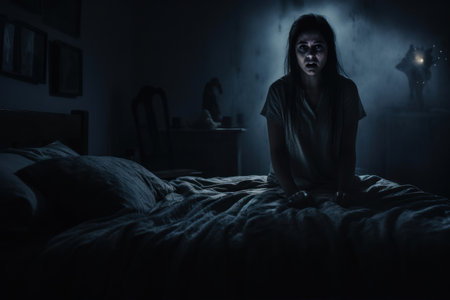 Young woman sitting on the bed in the dark. Scary horror scene.