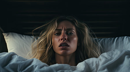 a depressed woman lying on her bed, capturing the raw emotions etched on her face as she grapples with feelings of sadness and isolation