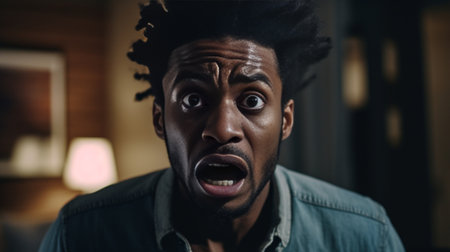 Intense Emotion of Fear Captured in a Close-Up of a Man's Face with Wide Eyes and Open Mouth in a Dark Setting, Evoking Raw Human Experience