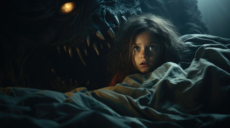 A little boy in bed at night is afraid of a monster. The concept of childhood fears and nightmares