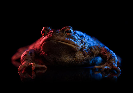 Common toad portrait in red and blue neon light isolated on black background with reflection.
