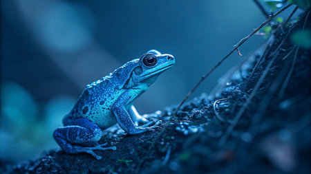 A blue frog sits poised on a branch, bathed in cool, monochromatic lighting.