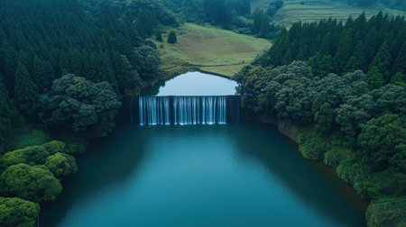 Breathtaking aerial view capturing a majestic waterfall cascading into a serene lake, framed by verdant forests and rolling hills, evoking tranquility.