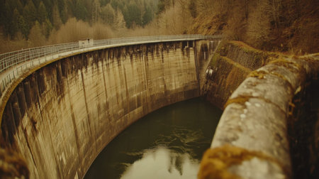 A captivating view of a concrete dam showcases its robust structure surrounded by soft autumn hues. The calm water reflects the serene landscape, creating a peaceful atmosphere.