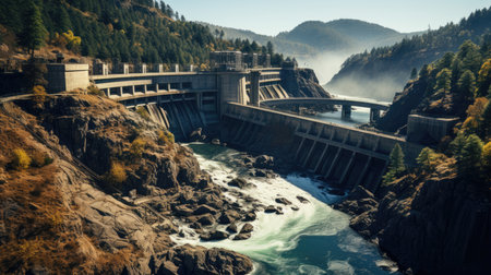 A majestic dam harnessing river power with cascading water amidst lush forests and mountains