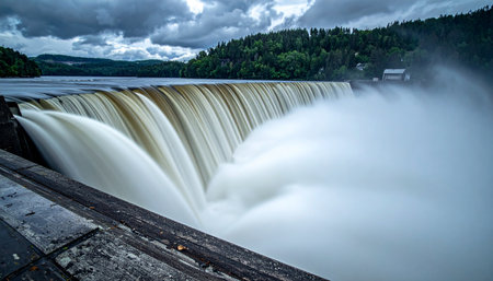 Water cascading down the face of a dam, forming a breathtaking waterfall as excess water is released from the reservoir.