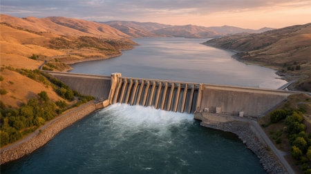 Stunning aerial view of a dam at sunset, releasing powerful white water into a calm reservoir. Surrounded by scenic hills, it captures natural beauty and tranquility.