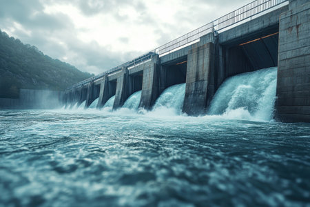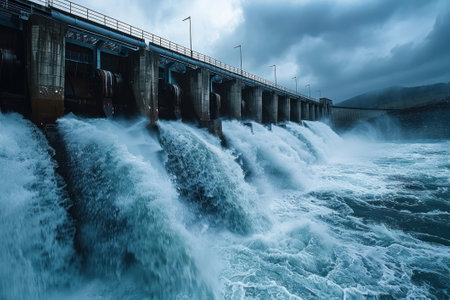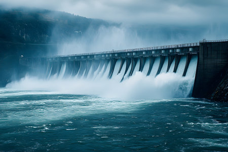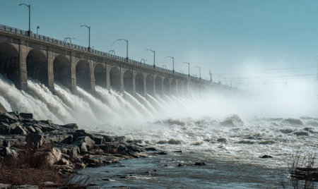 A large dam with water flowing through turbines, generating hydroelectric power