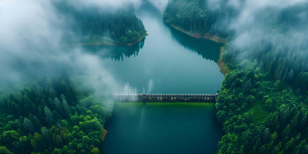 A breathtaking view of a hydroelectric dam where water cascades down into a serene river, surrounded by lush forests and misty mountains, showcasing nature's beauty.