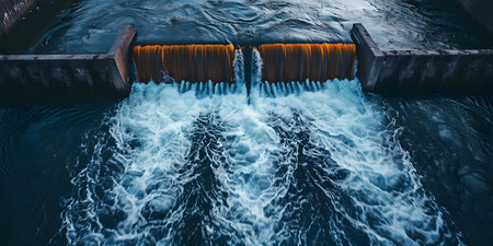 Water flowing out of a dam at a hydroelectric power plant showing renewable energy generation. Concept Hydroelectric Power, Renewable Energy, Dam, Water Flow, Energy Generation