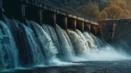 Torrent in dam releasing water for hydroelectric turbines, generating energy., generative AI