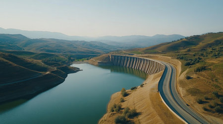 A sweeping landscape view of a large dam with a road crossing over it, showcasing the engineering marvel against the backdrop of a vast water reservoir