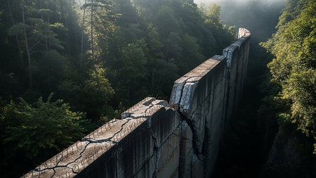 A large concrete dam wall extensive cracking and exposed rebar, nestled within a dense green forest under a misty, atmospheric sky.