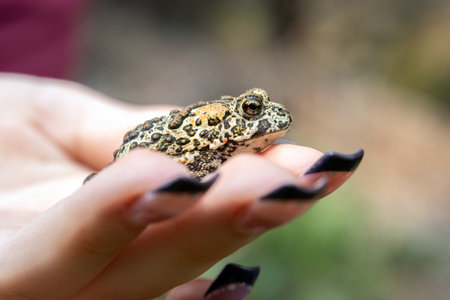 Female hand with manicure holds a cute little Canadian toad (or Dakota toad) found in the woodland in summer.