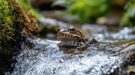 Wild green frog is taking a bath in a pristine water stream in the forest