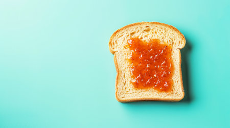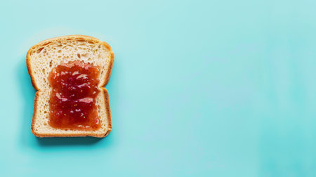 Delicious bread toast with jam, aesthetic pastel light blue background. Copy space, top view. Generative AI.